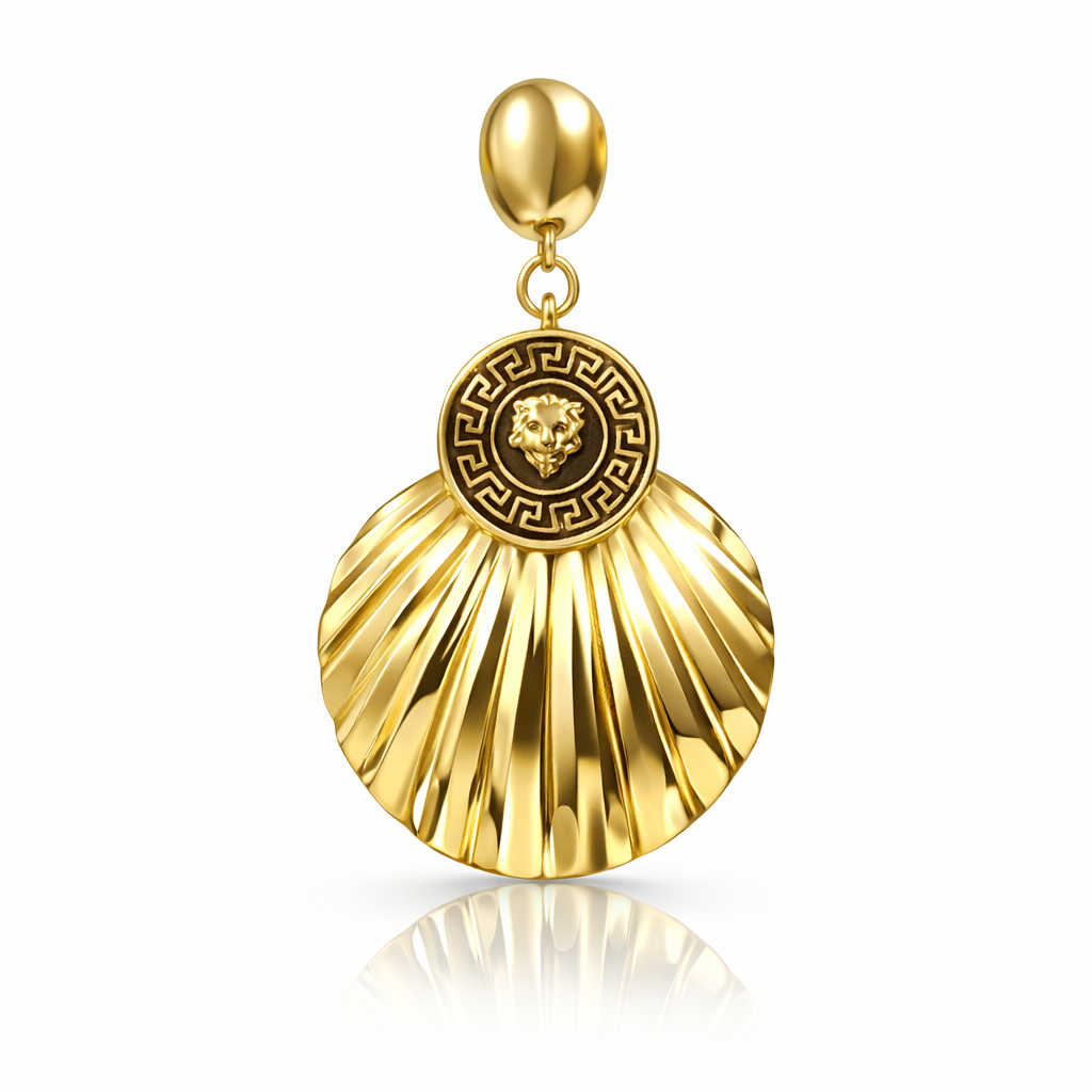 Elegant gold statement earring featuring a drop with a detailed medallion accent. Designed to stand out, it blends bold texture with a luxurious finish—perfect for elevating both formal and chic everyday looks.